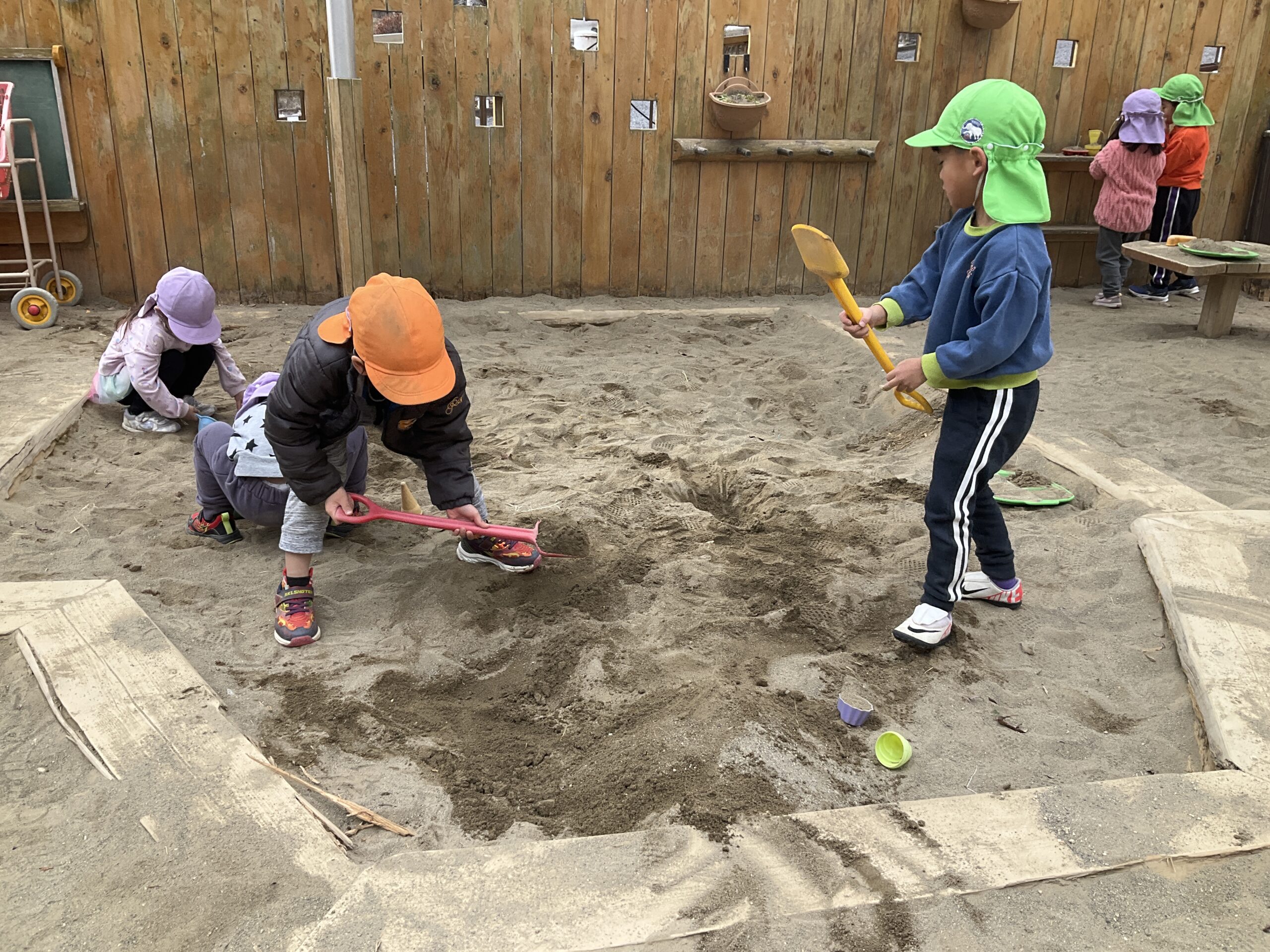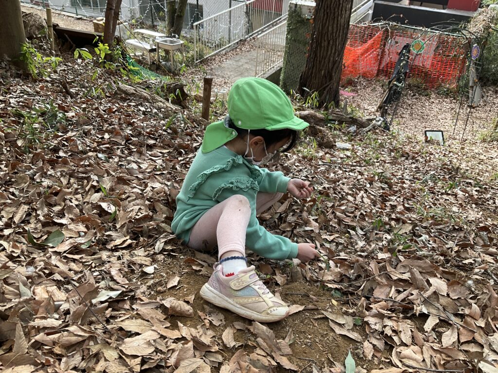 今日の活動は園庭かみんなのもりか、どちらで遊ぶか子どもたちが選択して遊びました。「砂場で遊びたいから園庭にしよう!」「どんぐりを拾いたいからみんなのもりに行きたい!」と、それぞれが目的を持って遊ぶ場所を選んでいました。