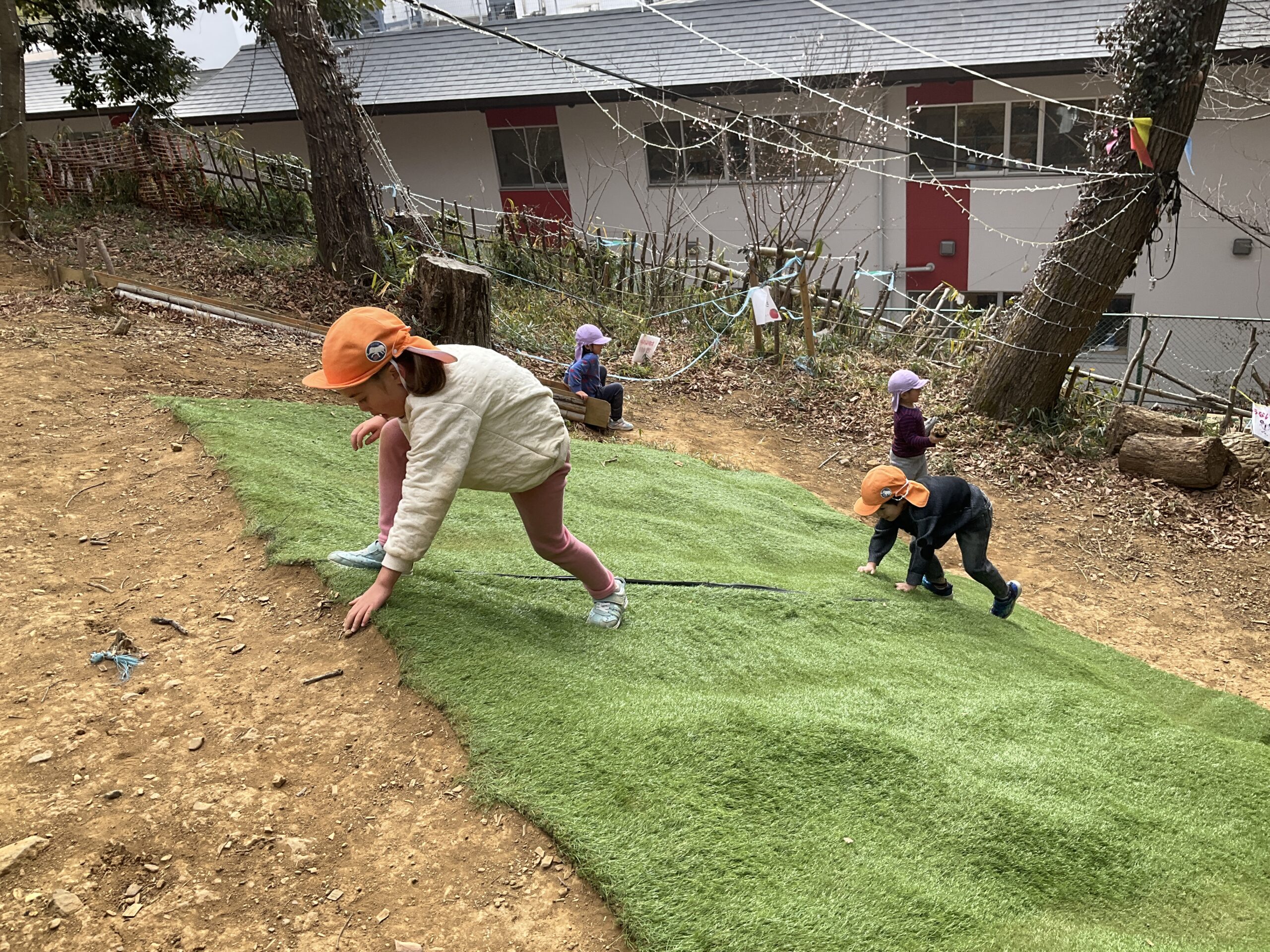 園庭では自転車に乗ったり砂場で山をつくったり、、、みんなのもりではどんぐり拾いや坂道登りなどを楽しみました。自分で選択したことで普段にも増して遊び込む様子が見ら、「あー、楽しかった!」と、大満足の子どもたちでした。
