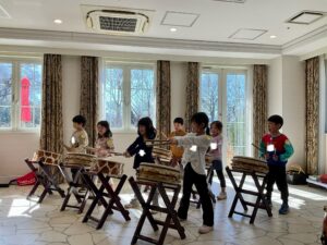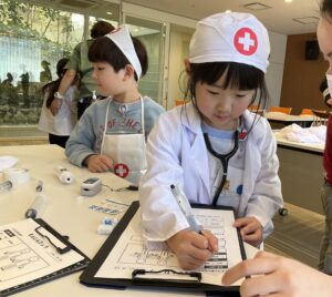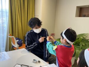 年長クラスが北原リハビリテーション病院へ訪問させていただきました。日頃の練習の成果を発揮し、和太鼓の披露を行いました。力強い音が響く中、子どもたちは少し緊張しながらも堂々とした表情で演奏し、大きな拍手をいただくことができました。友達と心を合わせて叩く姿から、これまで積み重ねてきた頑張りと成長が感じられました。その後は職業体験として、子どもたち用にご準備いただいた問診票を使い、患者役の方に話を聞きながら記入する体験を行いました。「どこが痛いですか」「いつからですか」と丁寧に質問し、相手の話をよく聞き取ろうとする姿はとても真剣でした。さらに、体験や心臓マッサージの方法も教えていただき、説明をしっかり聞きながら意欲的に取り組む子どもたちの姿が見られました。普段はなかなかできない貴重な経験を通して、医療のお仕事への関心や思いやりの気持ちがより一層深まった一日となりました。