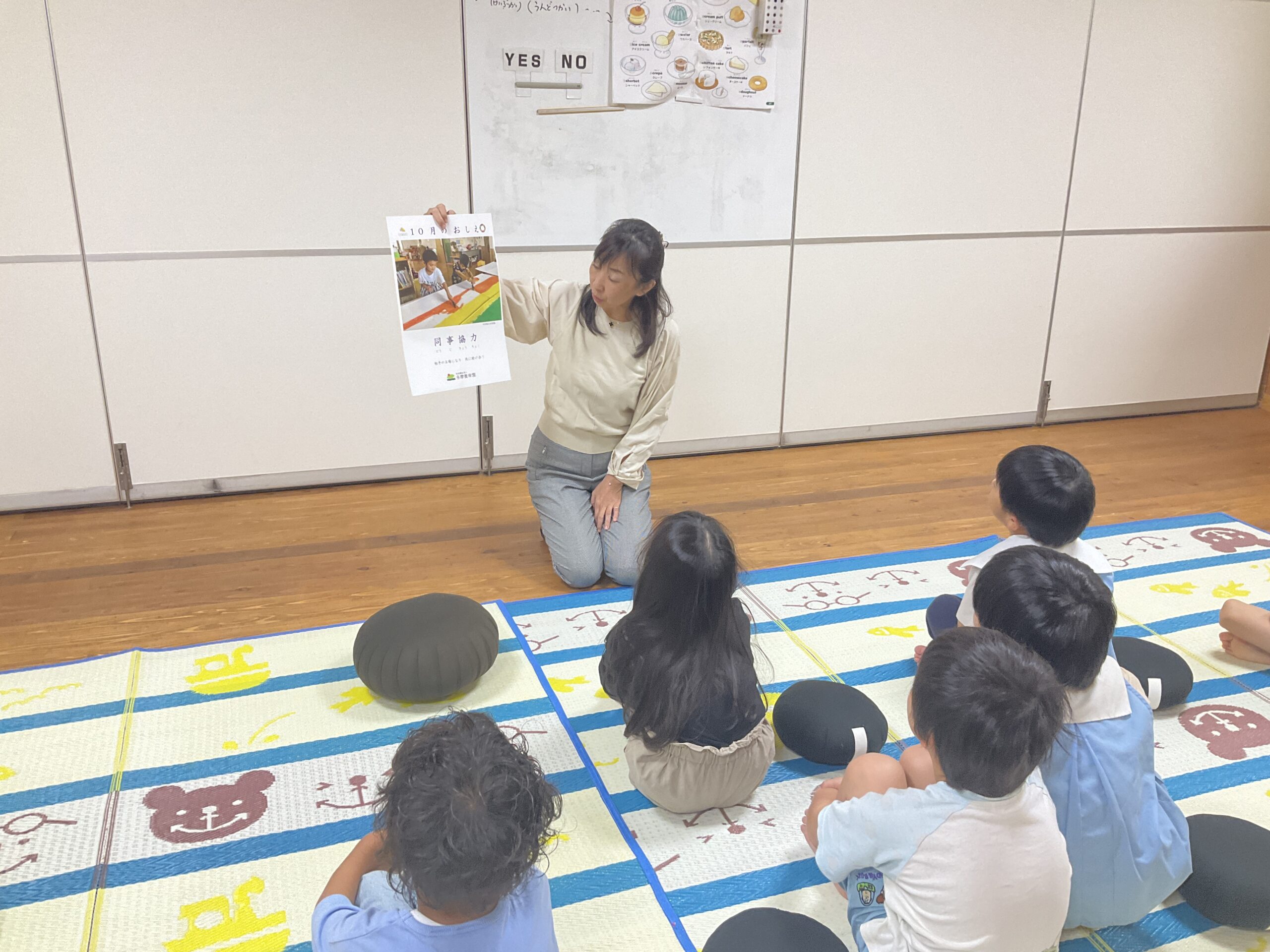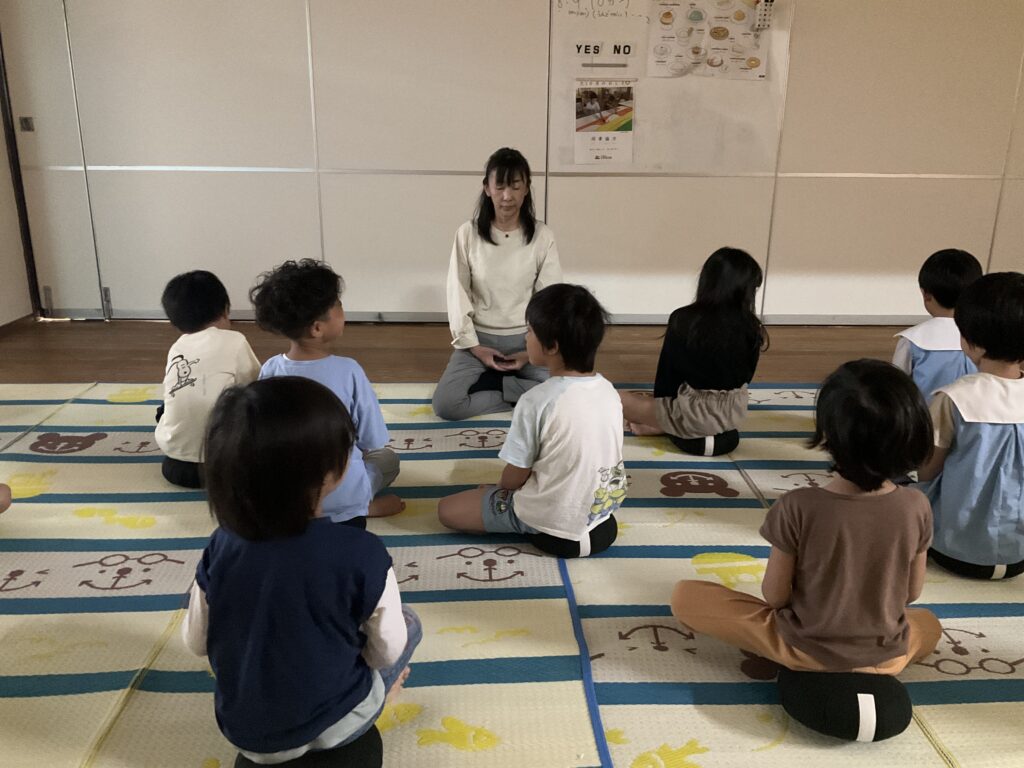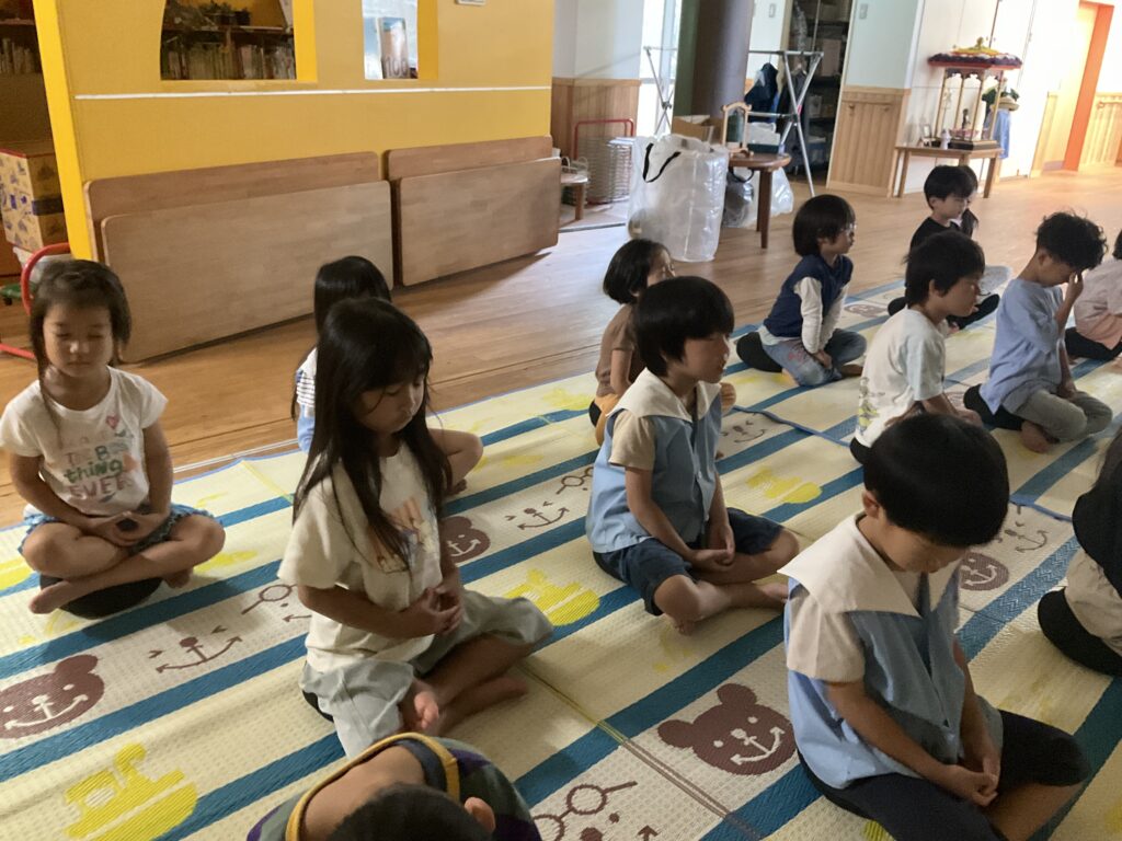 毎月1日は心の日です。今月の目標は「同事協力」です。年長道組は坐禅を行い、園長先生からお話を聞き、「相手の立場になって共に助け合って過ごしていこう」という意味についてみんなで考えました。ぜひご家庭でもお話をしてみてください。