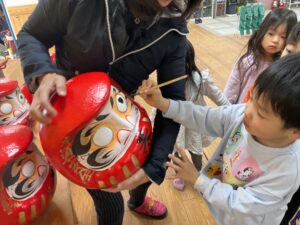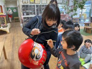 また、だるまの目入れも行いました。「○○な一年にしたい」「○○ができるようになりたい」「元気に過ごしたい」、そのような願いを込めて、子どもたちがだるまに目を描きます。だるまは『七転び八起き』の象徴とされています。だるまを転がしてみると、「起き上がって来る!」とだるまの姿に驚いた様子でした。様々な事に積極的にチャレンジし、一度で成功しなくても諦めずに立ち上がる。という事を、だるまの姿から学んだ子どもたちでした。