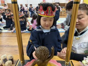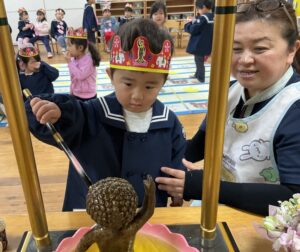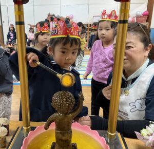 子ども達は花御堂の中にいらっしゃる小さなお釈迦様に甘茶をかけて優しい気持ちで誕生をお祝いすることができました☆そして、みんなが健康で過ごせるように手を合わせ、甘茶をいただきました。