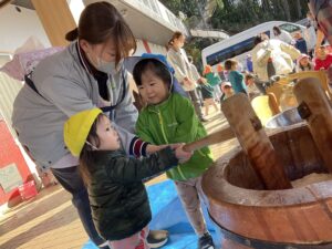 子どもも大人も杵を持ち、臼に向かって「よいしょ!」みんなで掛け声をして応援!子どもたちはついたおもちの感触が杵から伝わり「くっついた!」とその弾力に驚きそれぞれ気持ちを言葉で表していました。