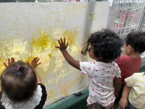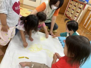 0歳児さんは足型でピンクのかわいいうさぎさんを作ってくれて、1歳児さんははじき絵で黄色のお月さまを作って、黒い夜空のような布の上に貼ると、とっても素敵なお月見の壁面が完成しました!
